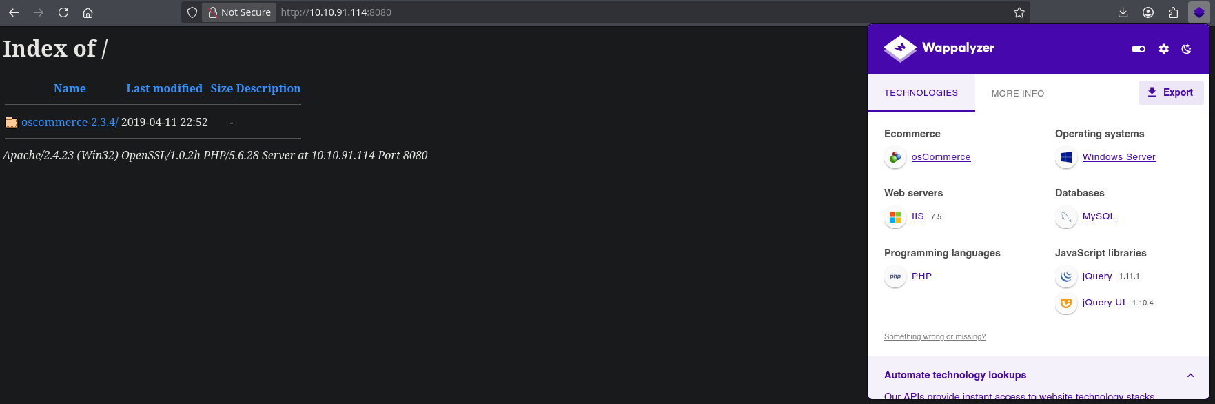 /Install (Status: 301) [Size: 371] [--> http://10.10.91.114:8080/oscommerce-2.3.4/catalog/Install/]