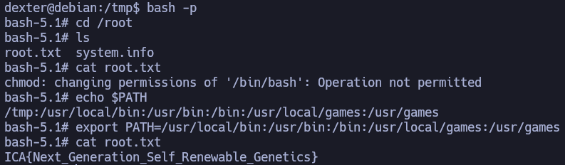 We see cat /root/system.info, it’s a command that is being executed by root using a relative route, so I can hijack it.