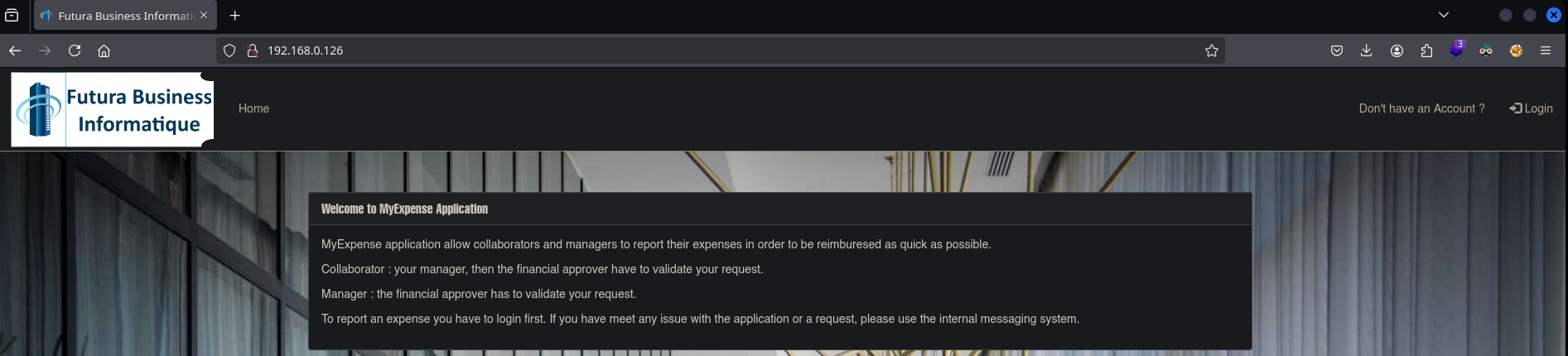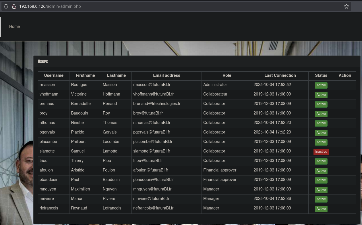 You are Samuel Lamotte and you have been fired from Futura Business Informatique. The company owes you €750, but you were fired. Right now, you are in your car in front of the company. Furthermore, you are on the company’s internal network with your laptop. Your login credentials before being fired were samuel:fzghn4lw.