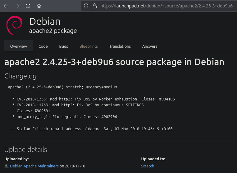 We can see some ports open. The most interesting port is the 80 port. Once we have scanned all ports of the machine it’s good to know the Debian codename behind the system, we need to Google the Apache version reported by nmap followed by ‘launchpad’.