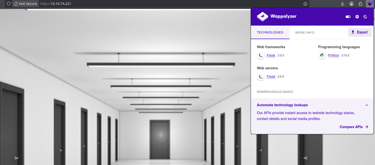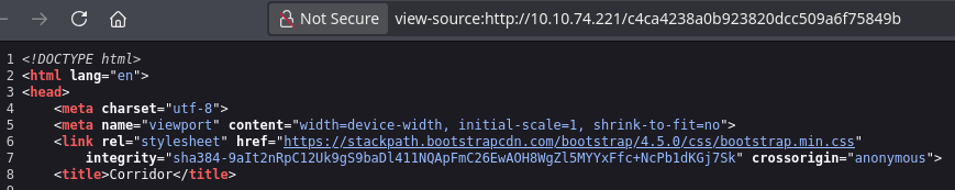 http://10.10.74.221 [200 OK] Bootstrap[4.5.0], Country[RESERVED][ZZ], HTML5, HTTPServer[Werkzeug/2.0.3 Python/3.10.2], IP[10.10.74.221], Python[3.10.2], Title[Corridor], Werkzeug[2.0.3]