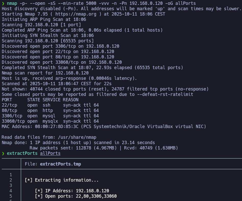 extractPorts reads the grepable export file allPorts, shows me the open ports and copy them in the clipboard. Let's perform a deeper scan with the parameter -sCV over those ports.