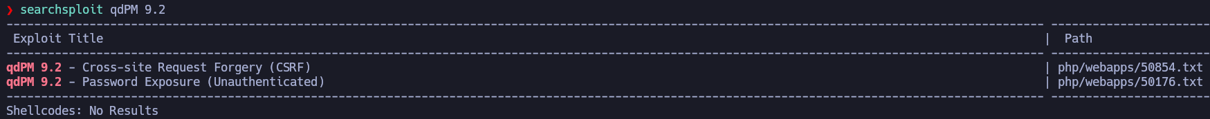 searchsploit found 2 exploits for the version 9.2 of qdPM. I'll focus on this project management tool, since we have to discover someting about a project. Let's see the second exploit.