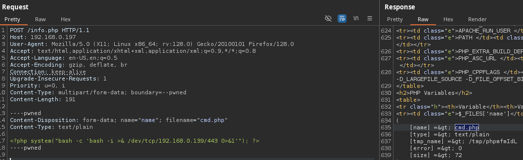 I'll focus on the LFI one. Firstly, we need a LFI vuln. I will use Burp Suite to send a POST request in order to force the upload of a PHP file. If I could find any way to force the server to interpretate my code (wich is a Reverse Shell) I could get into the server.
