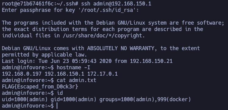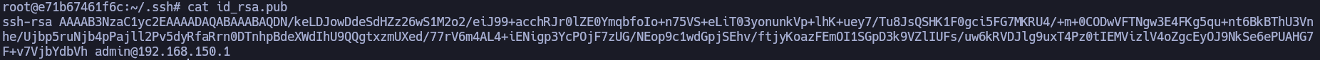 In the directory /root/.ssh we see a public key file wich shows that the user admin can connect to 192.168.150.1, there's "trust" between them.