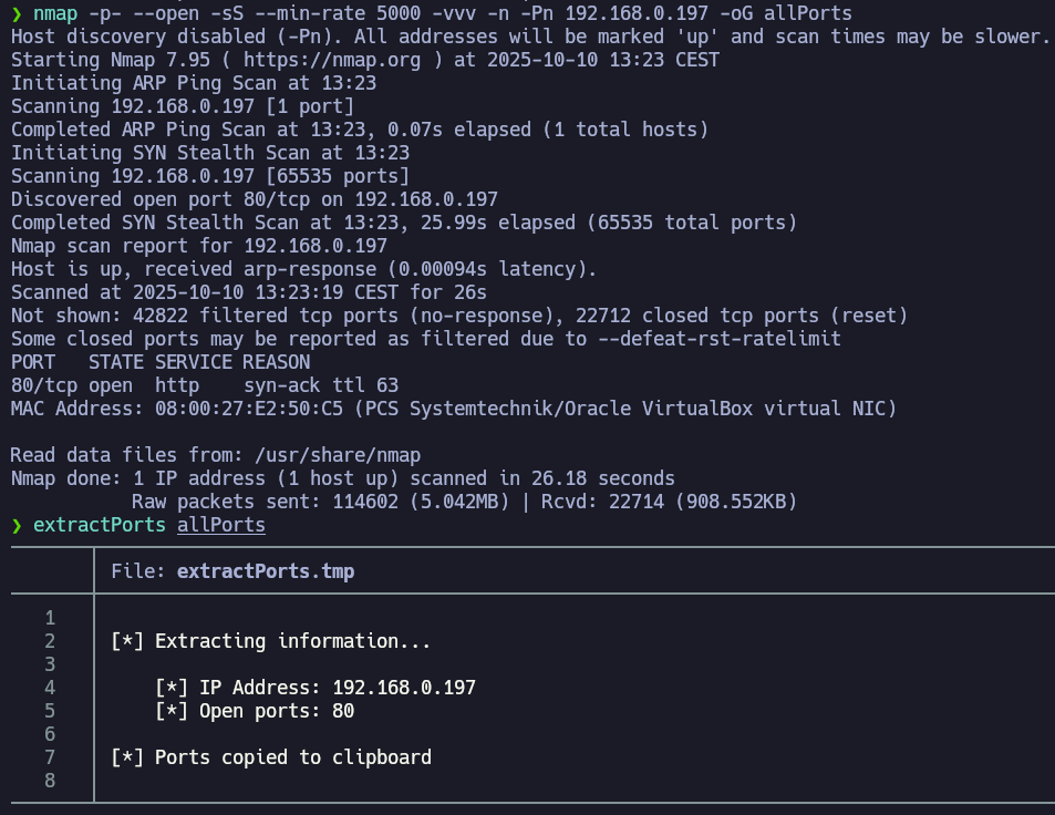 extractPorts reads the grepable export file allPorts, shows me the open ports and copy them in the clipboard. Let's perform a deeper scan using basic recon nmap scripts to see more information about the port 80.