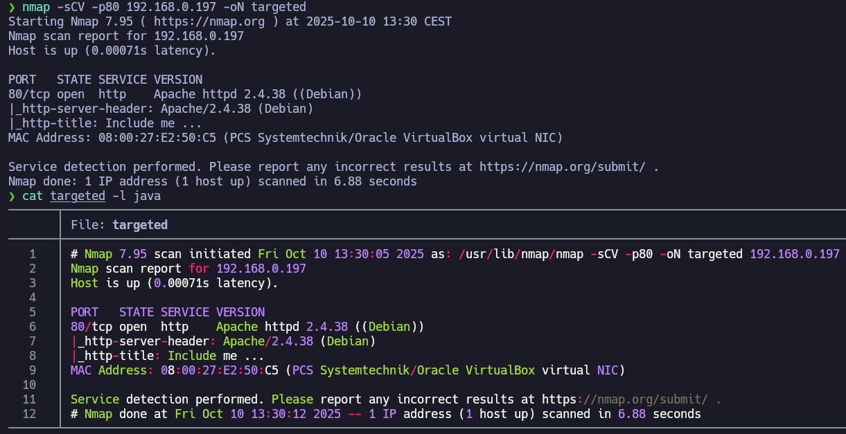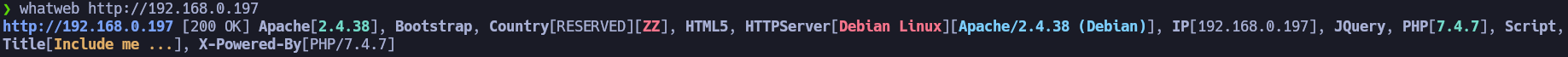 After performing this second scan we can see that we are facing an Apache web server running on a Debian machine. We can also see a title "Include me ...".