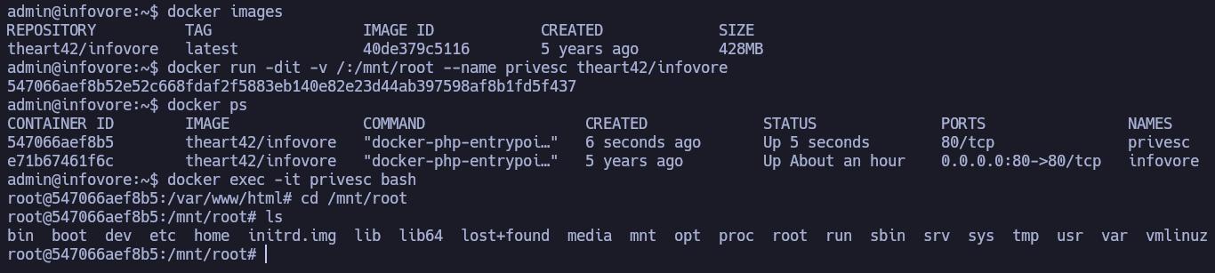 admin is in the docker group. In this case I can create a container that mounts all the filesystem (even the root directory) into my container filesystem so I can access all directories and files.