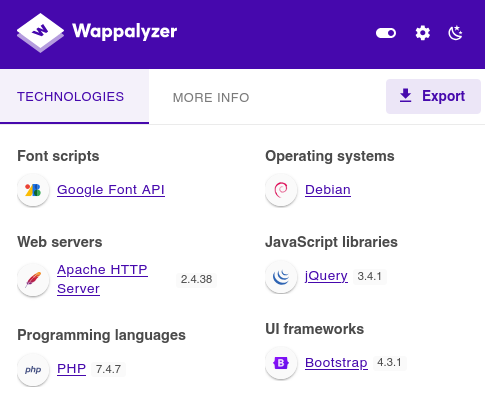 It seems that the page it's not configurated at all. The links and buttons doesn't work and we can't see anything interesting in the source code of the page. However, both Wappalyzer and WhatWeb are indicating that PHP is being used server-side.