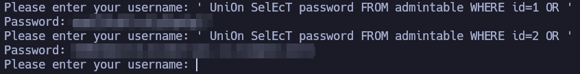 Please enter your username: ' UniOn SelEcT username FROM admintable WHERE id=2 OR '