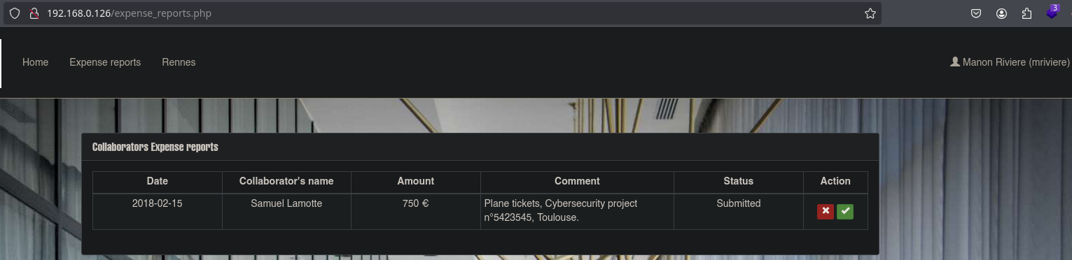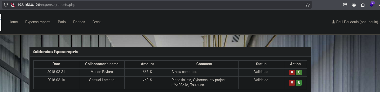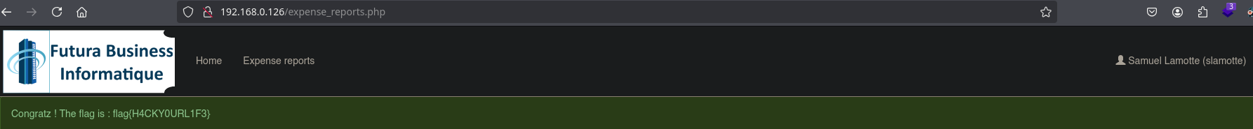 This writeup documents the penetration testing of the MyExpense: 1 machine. This machine has been downloaded from the VulnHub platform. You are Samuel Lamotte and you have been fired from Futura Business Informatique. The company owes you €750, but you were fired. Right now, you are in your car in front of the company. Furthermore, you are on the company's internal network with your laptop. Your login credentials before being fired were samuel:fzghn4lw. Your mission will be to compromise the company's security in order to authorize the payment they owe you.