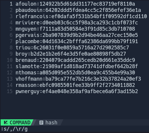 Finally, we obtain a string of users and passwords. We will format it with nvim to make it more readable.