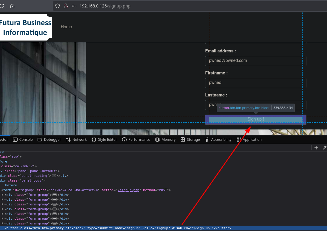 We will attempt to register a new account. After filling in the fields we notice the button is disabled; as simple as accessing the source code and removing the 'disabled' attribute from the button.